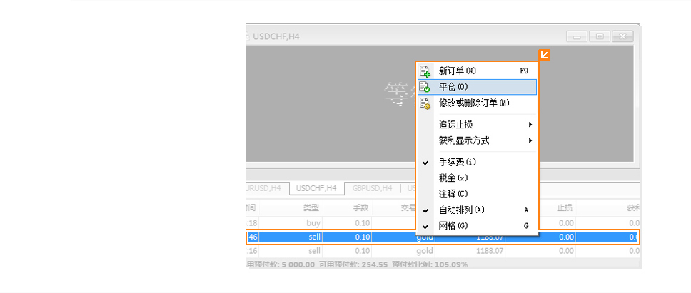 "平仓"选项,订单